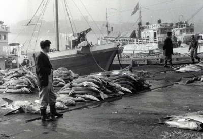 Visserschepen in een haven met vis op de kade, vermo...