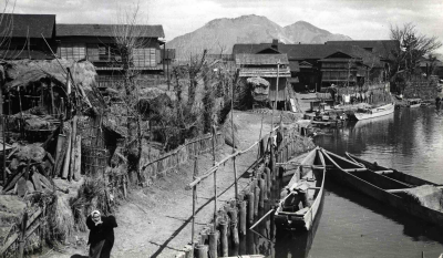 Huizen langs een rivier of kanaal in Japan. Op het w...