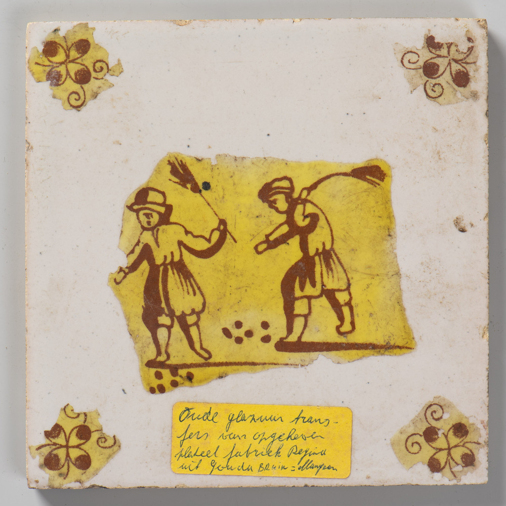 Tegel van aardewerk met tinglazuur en transferdruk, ...