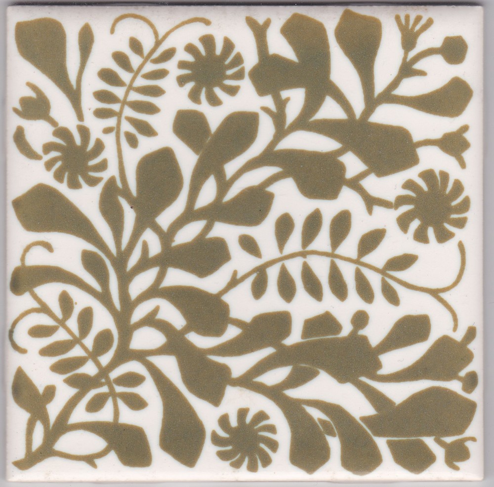 Tegel in zeefdruk, met voorstelling: decor Vetch, ve...