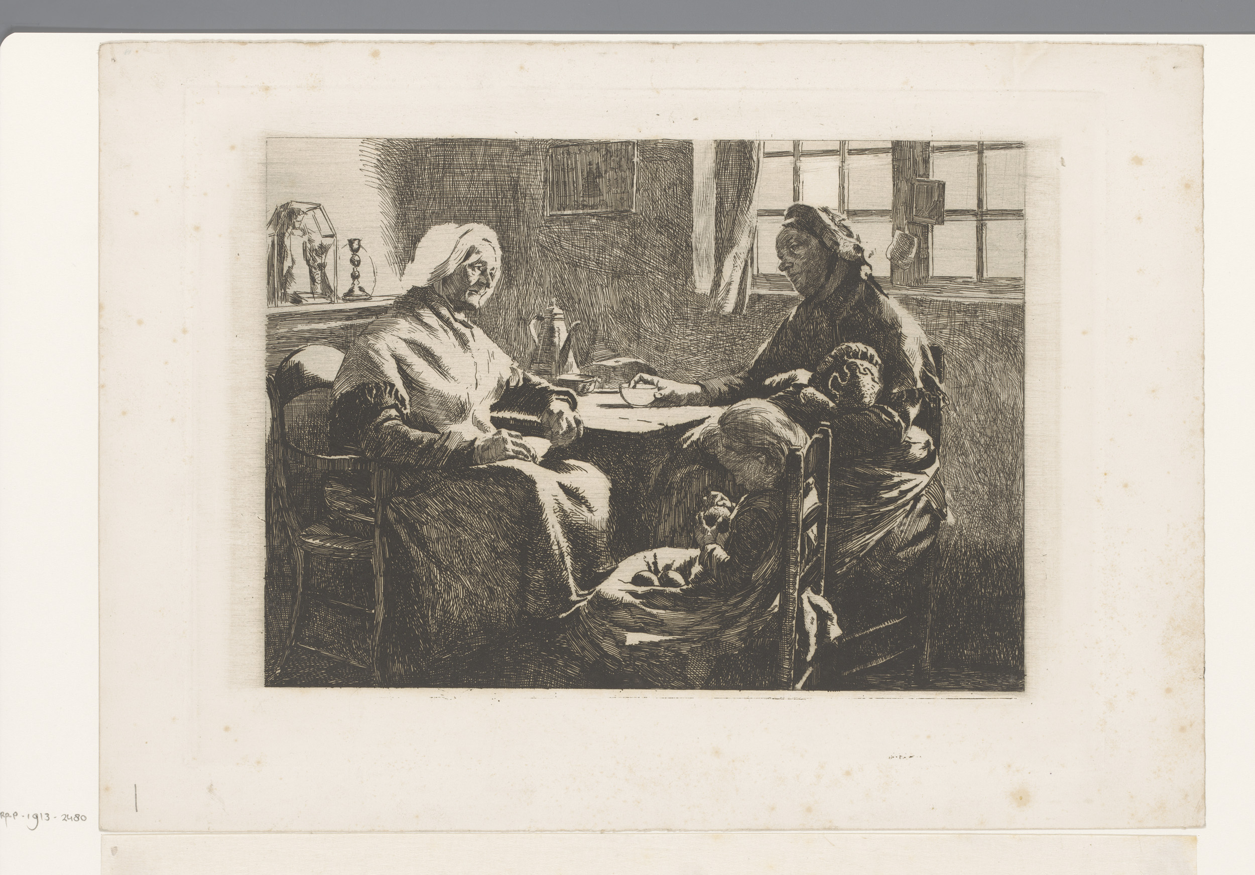 Oude vrouw aan tafel met kan en kom