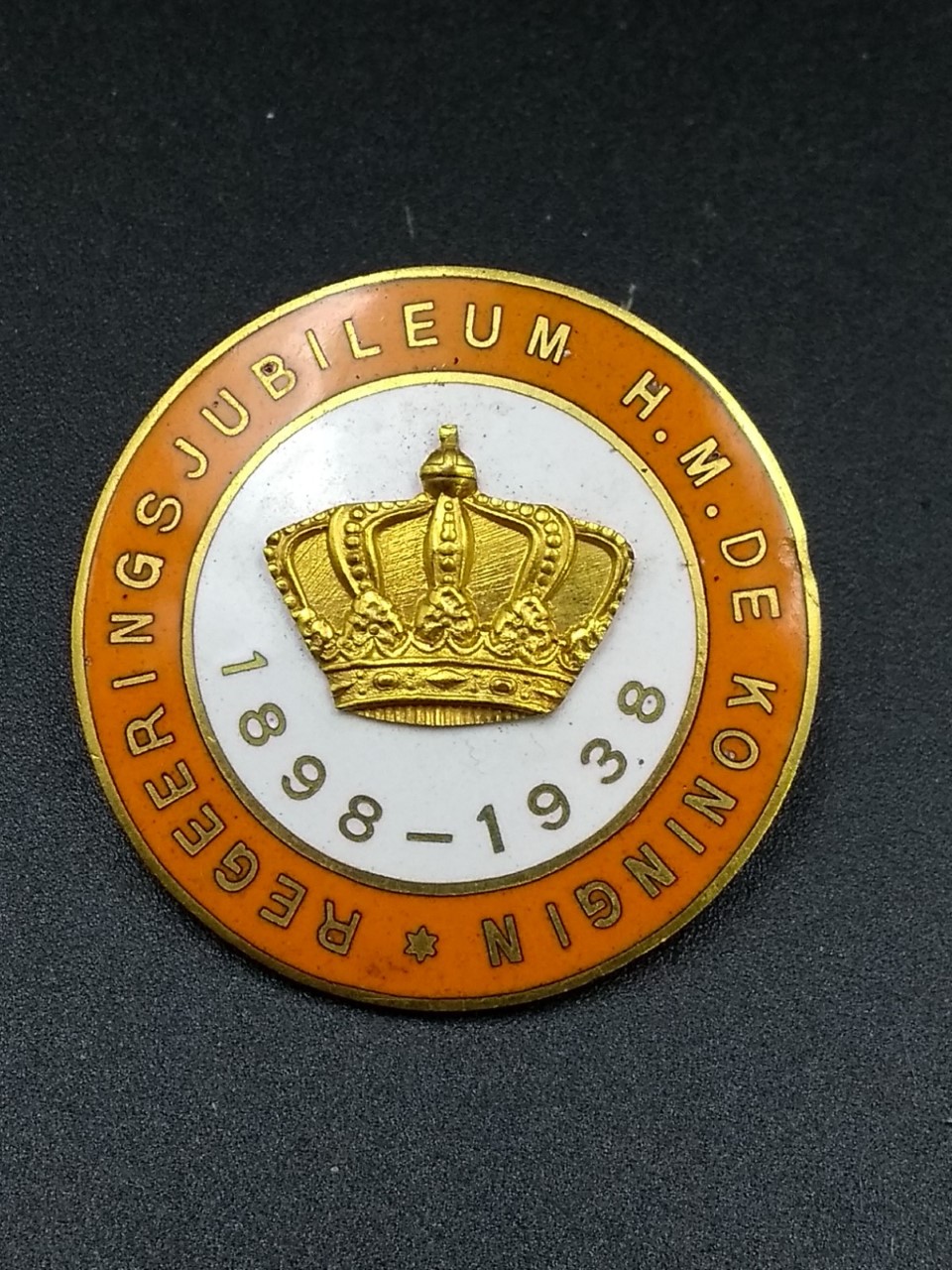 Speldje, wit met oranje rand en koperen letters 'Reg...