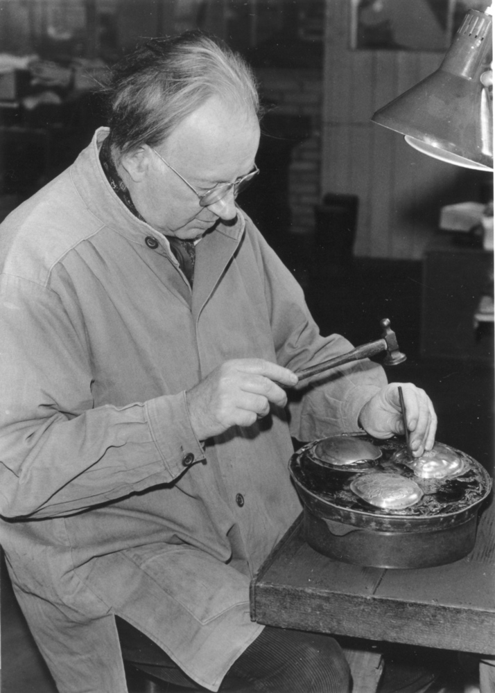 Piet de Weijer bezig met het ciseleren van deksels v...