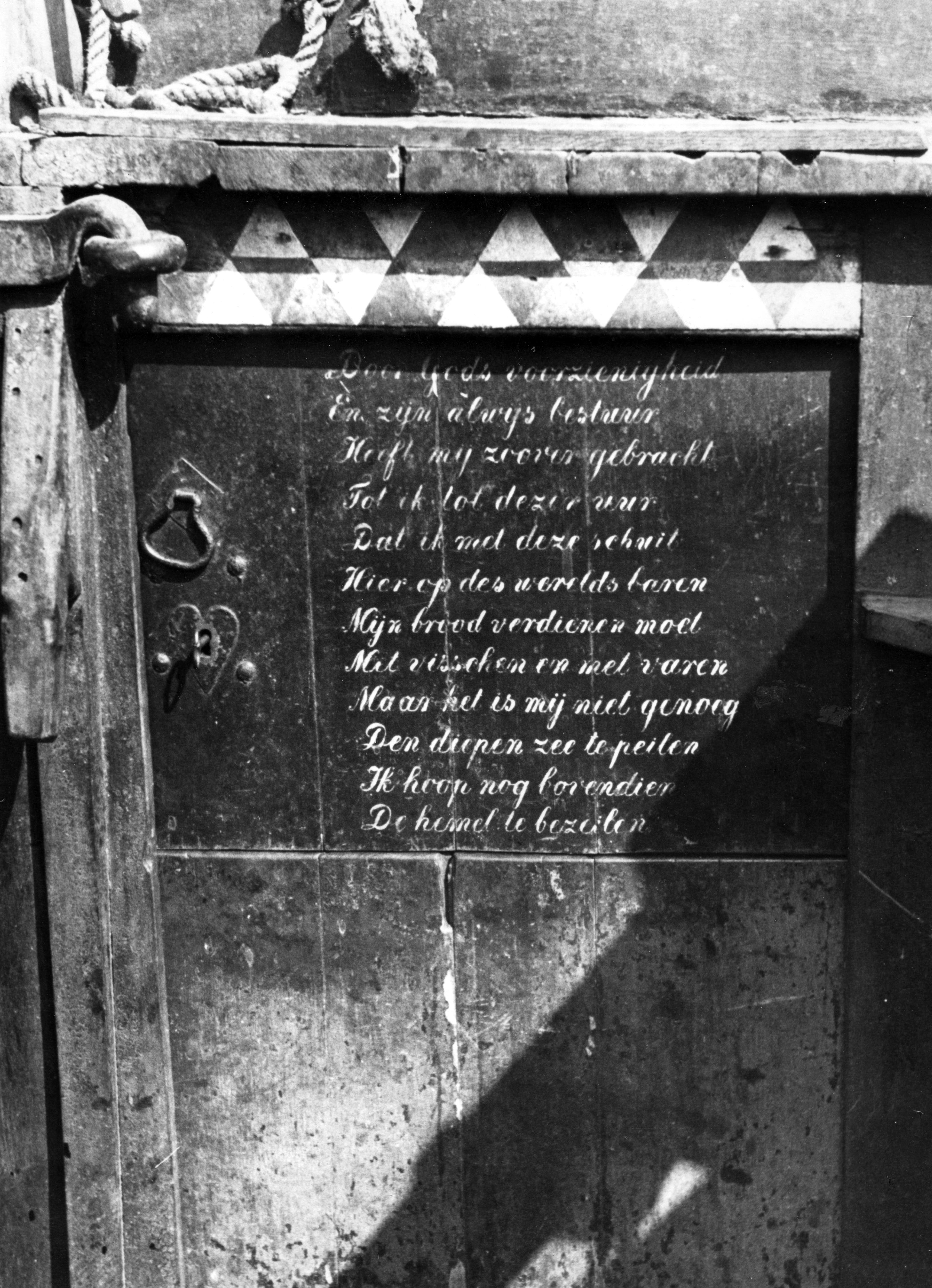 Vers op deur van botter, Marken, 1943 (zwart-wit foto)