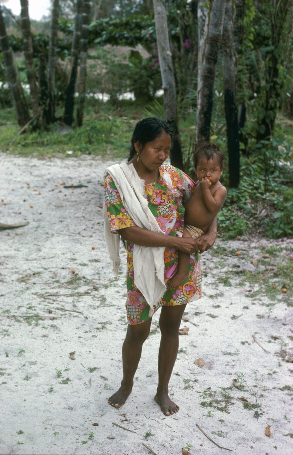 Inheemse moeder met kind op de heup in het dorp Powaka