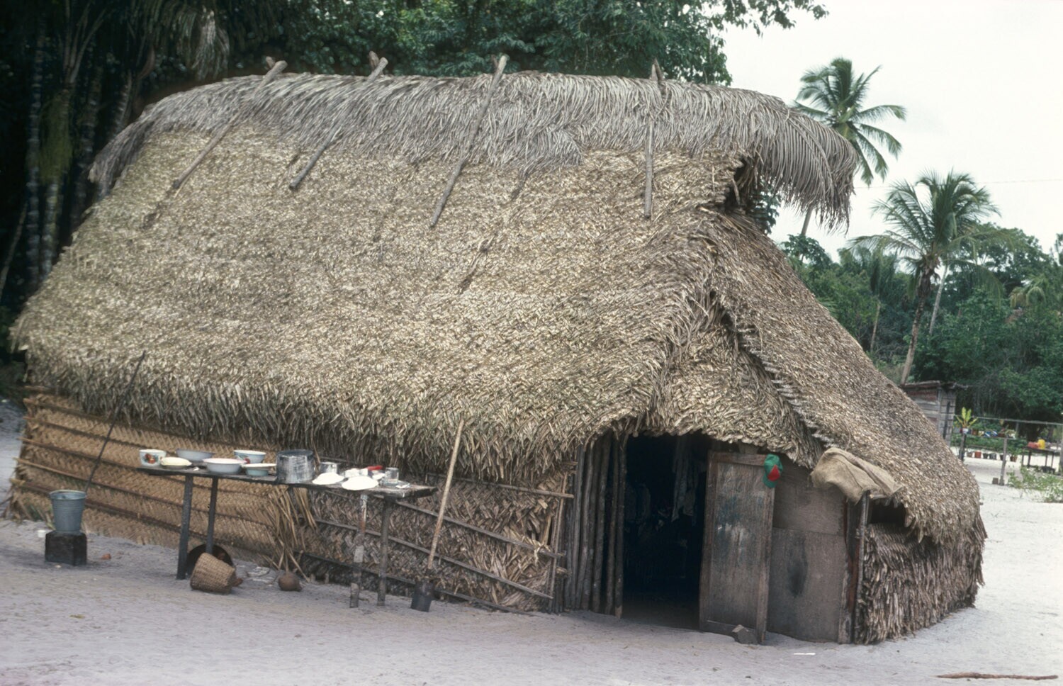 Woning van inheemsen in het dorp Powaka