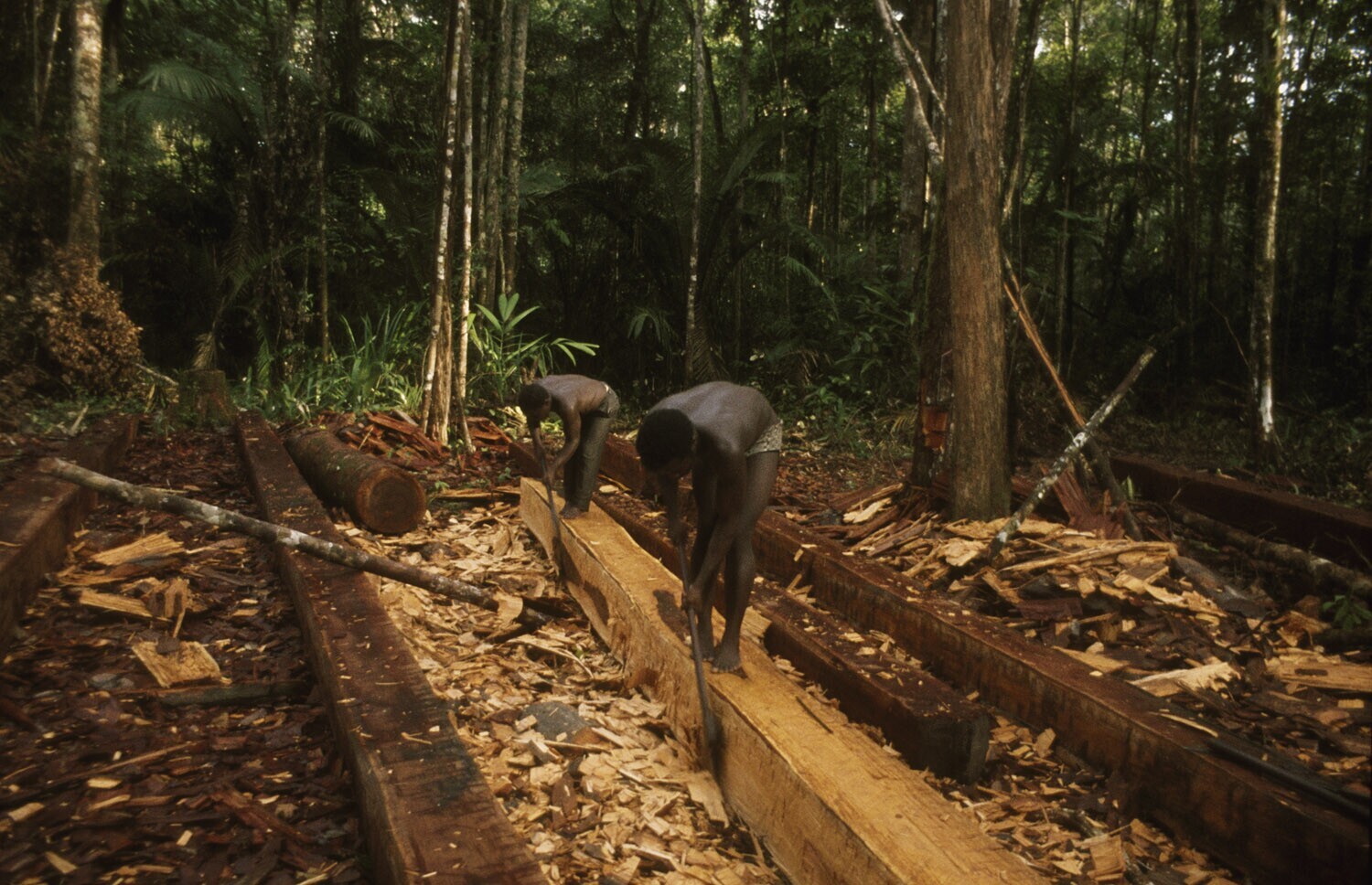 Boomstammen liggen klaar om met de hand verwerkt te ...