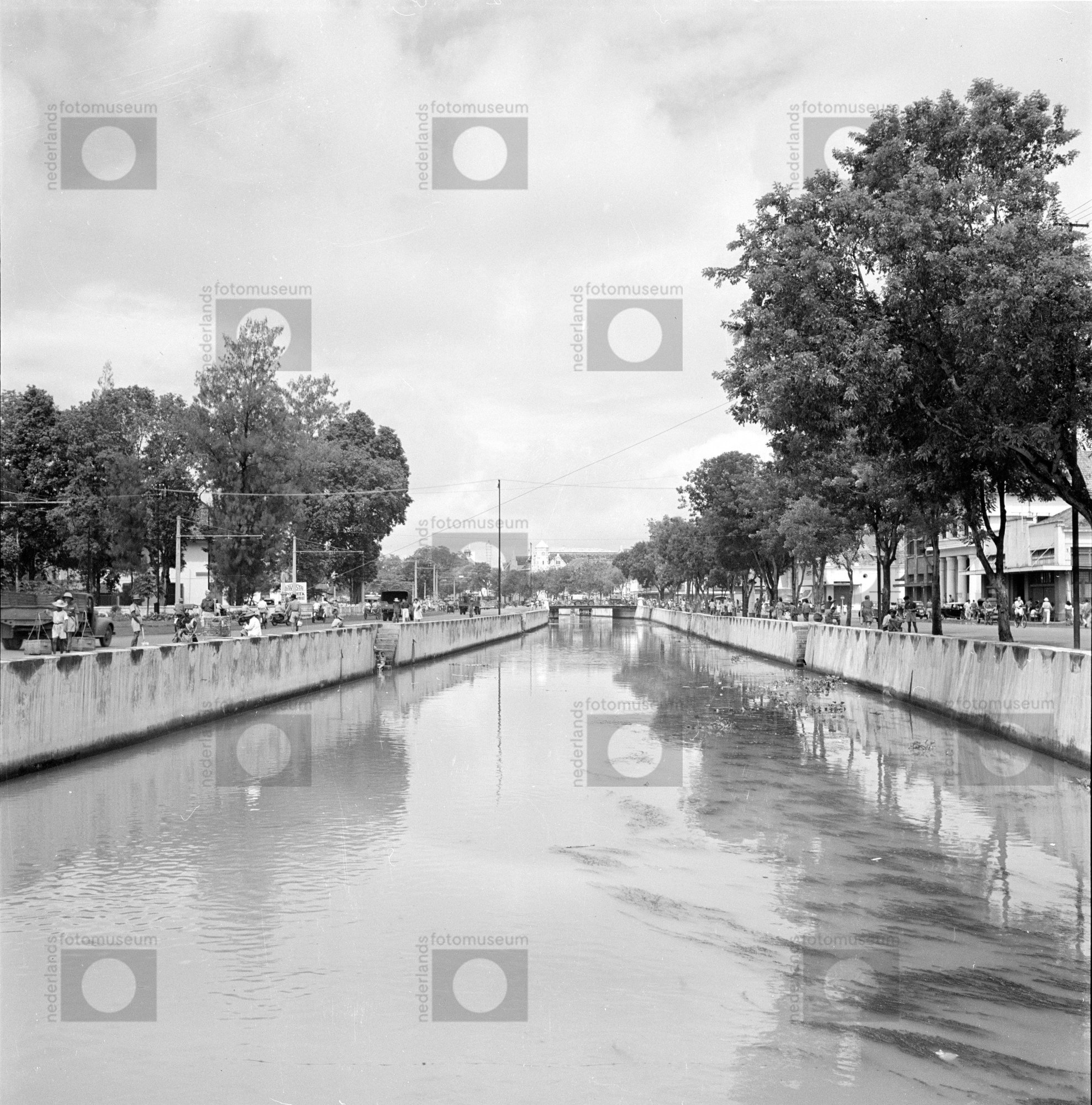 Doorzicht van stadsgracht met drukke straat en bebou...