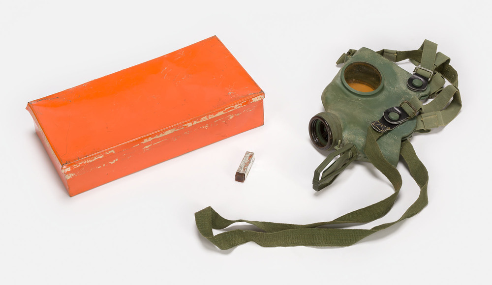 Oranje blik met een Nederlands civiel gasmasker