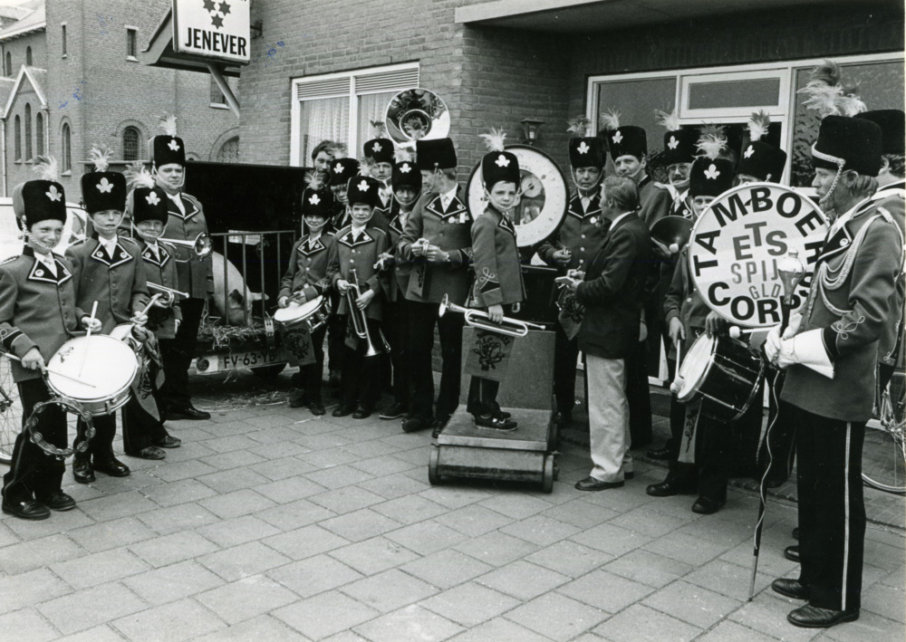 Zwart-wit foto van het tamboercorps ETS Spijk in 1970