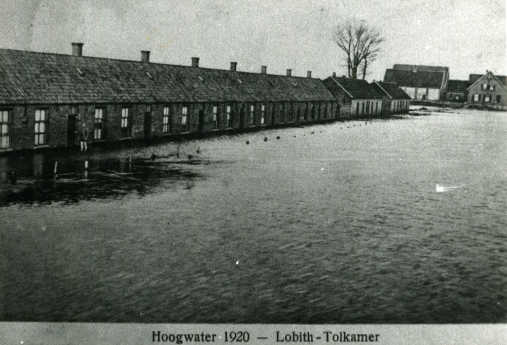 Reproductie van een zwart-wit foto van hoogwater te ...