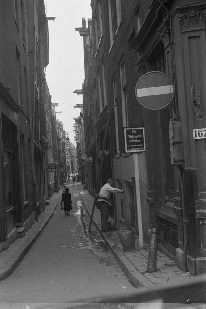 Een straatje in Amsterdam met een bordje "Für Wehrma...