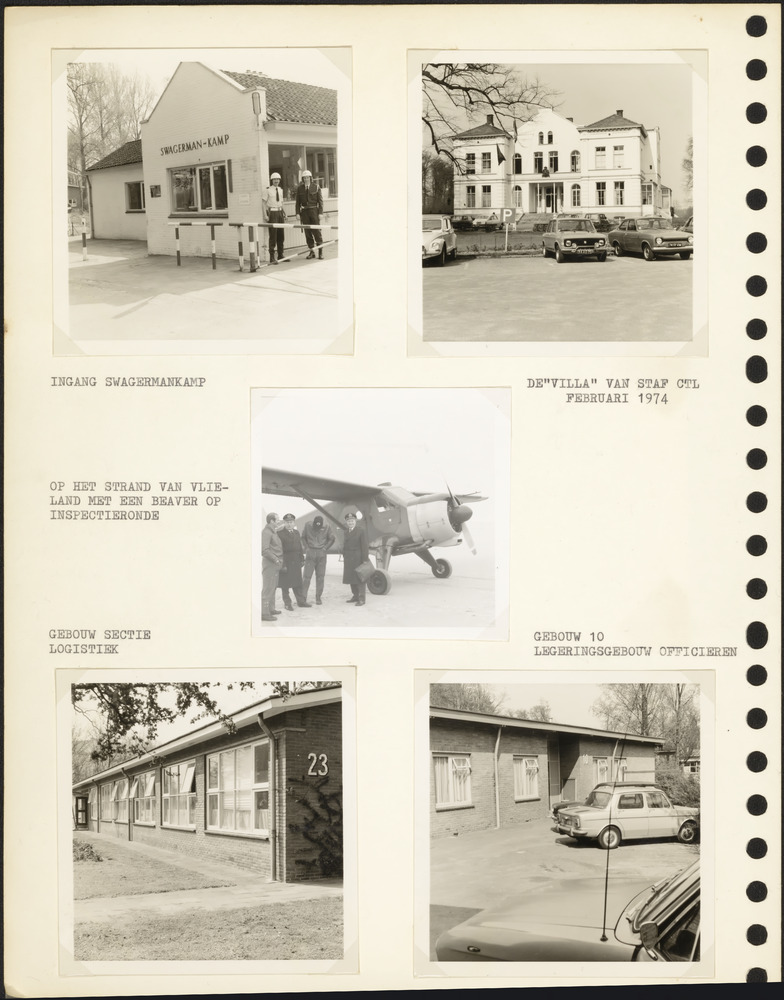 <p>Fotoboek pagina: Vijf foto's: 1: Ingang kamp te Z...