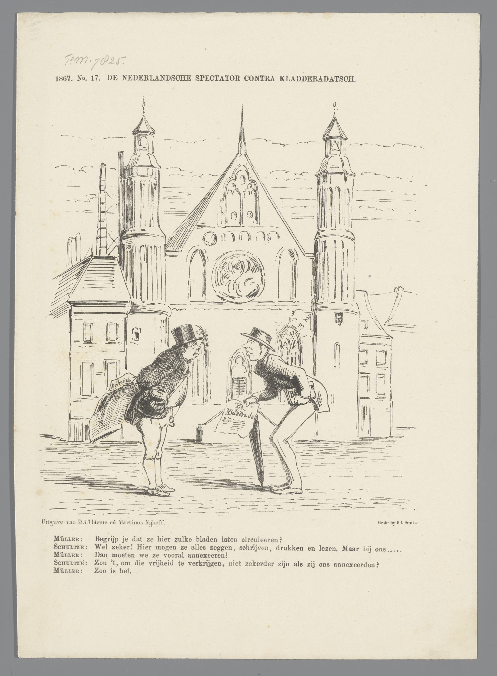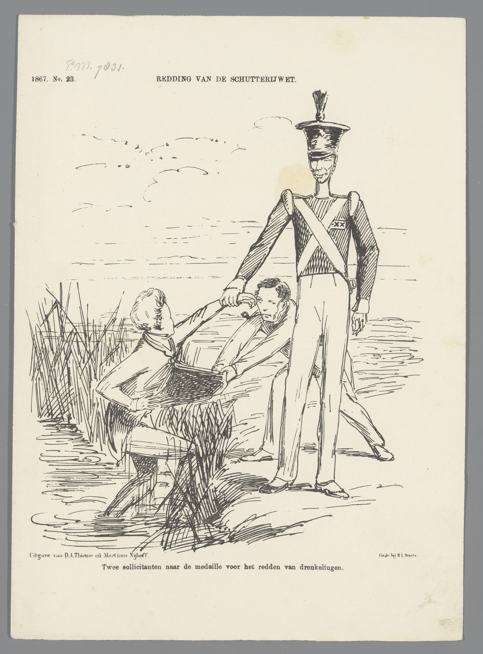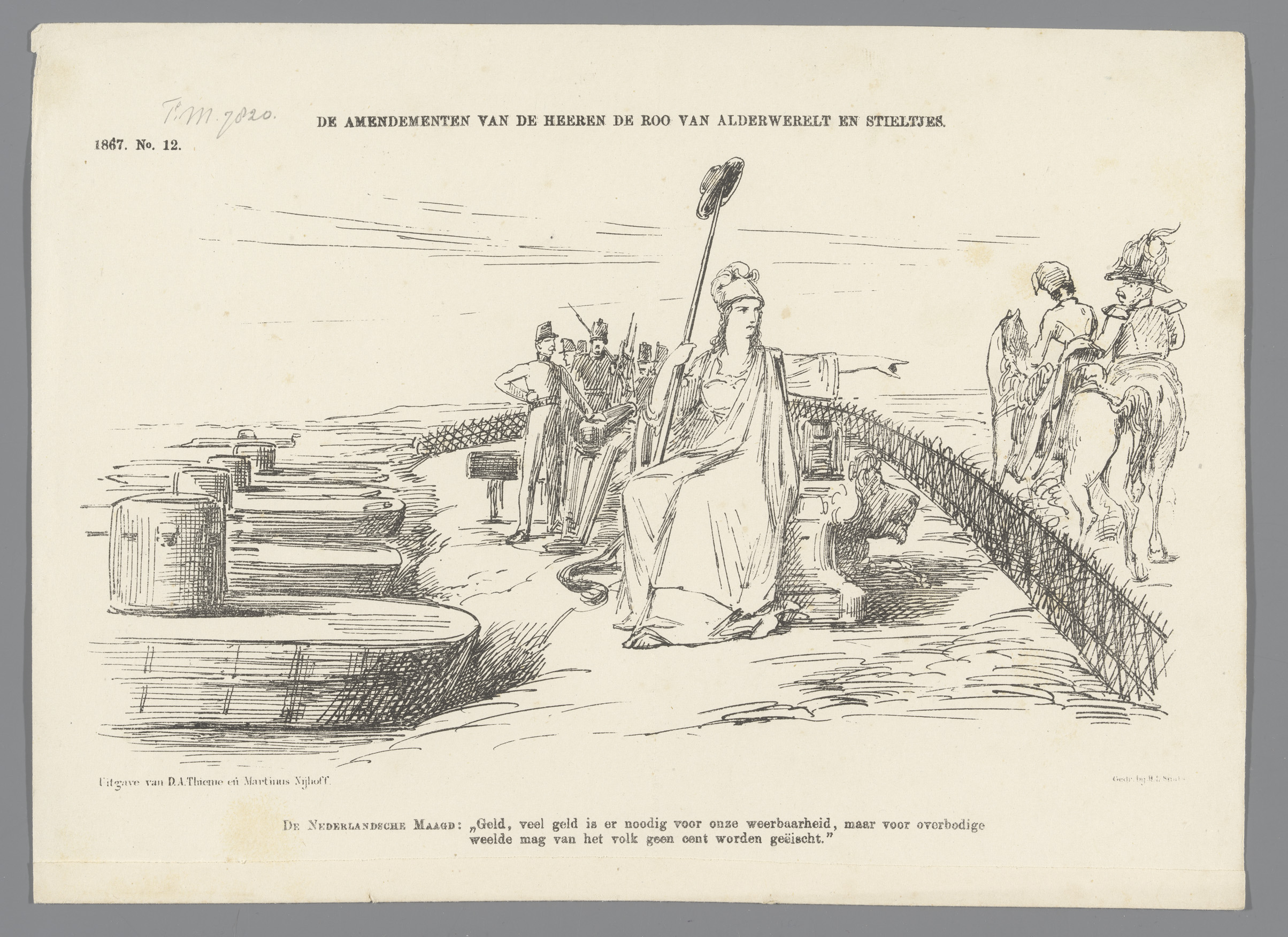 Spotprent op de vertraging van de Schutterijwet, 1867