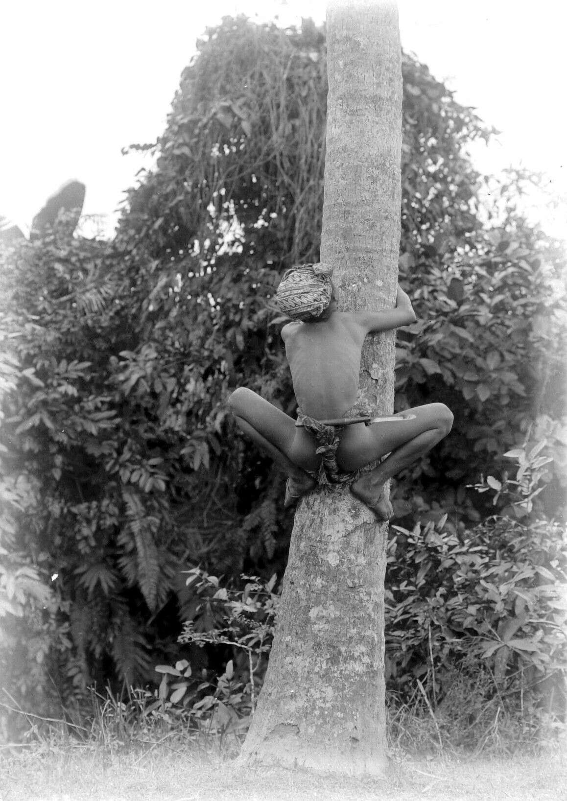 Jongen beklimt een kokospalm
