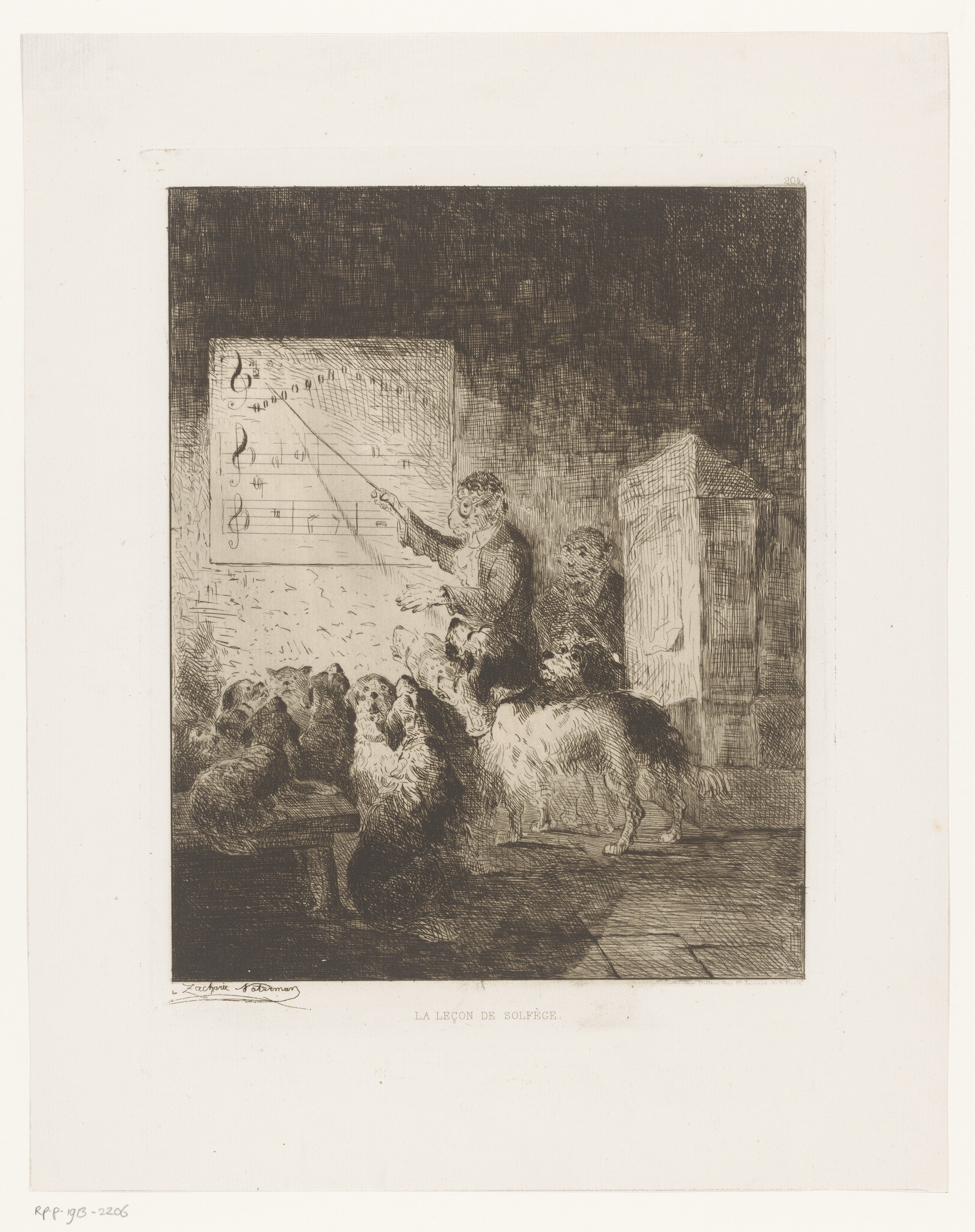 Aap geeft muziekles aan een klas met honden