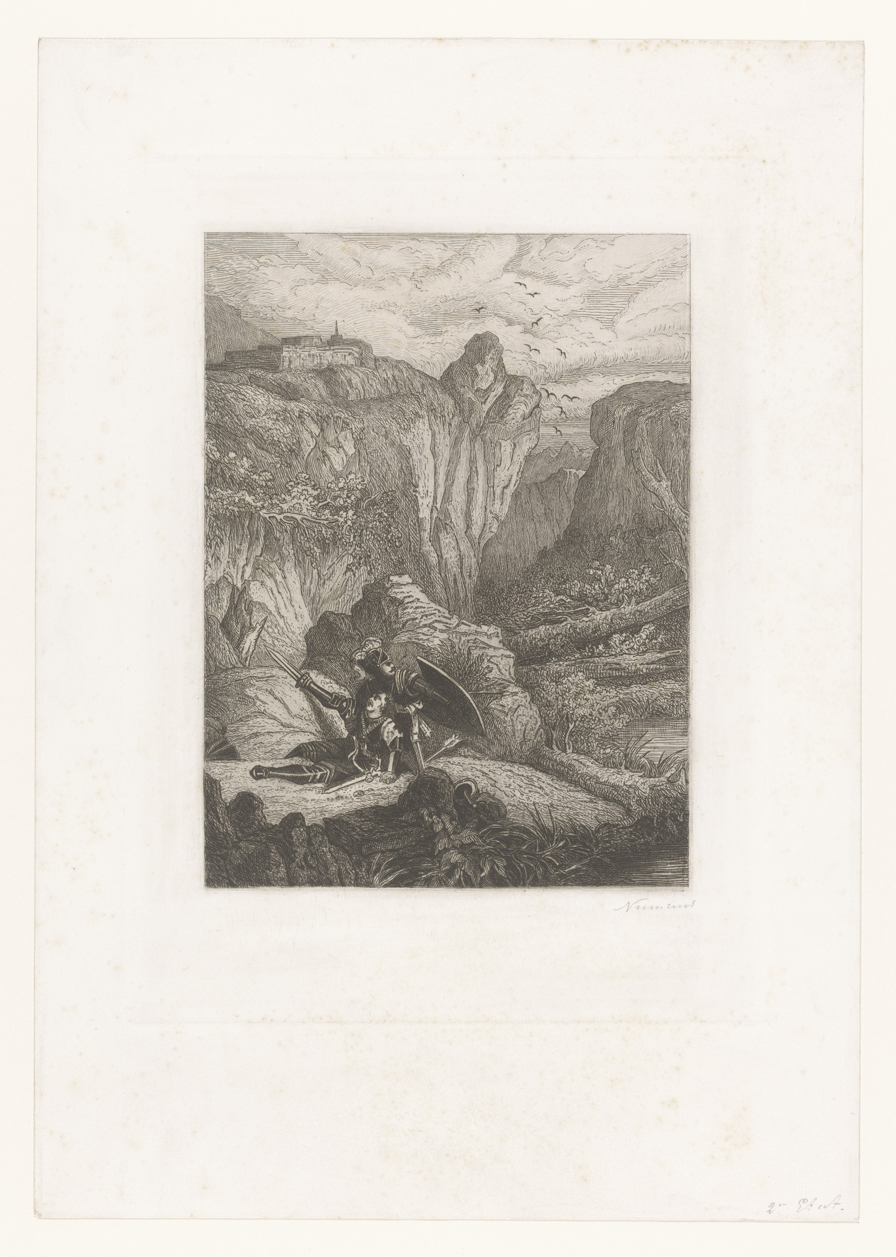 Twee ridders in harnas verdedigen elkaar in een rots...