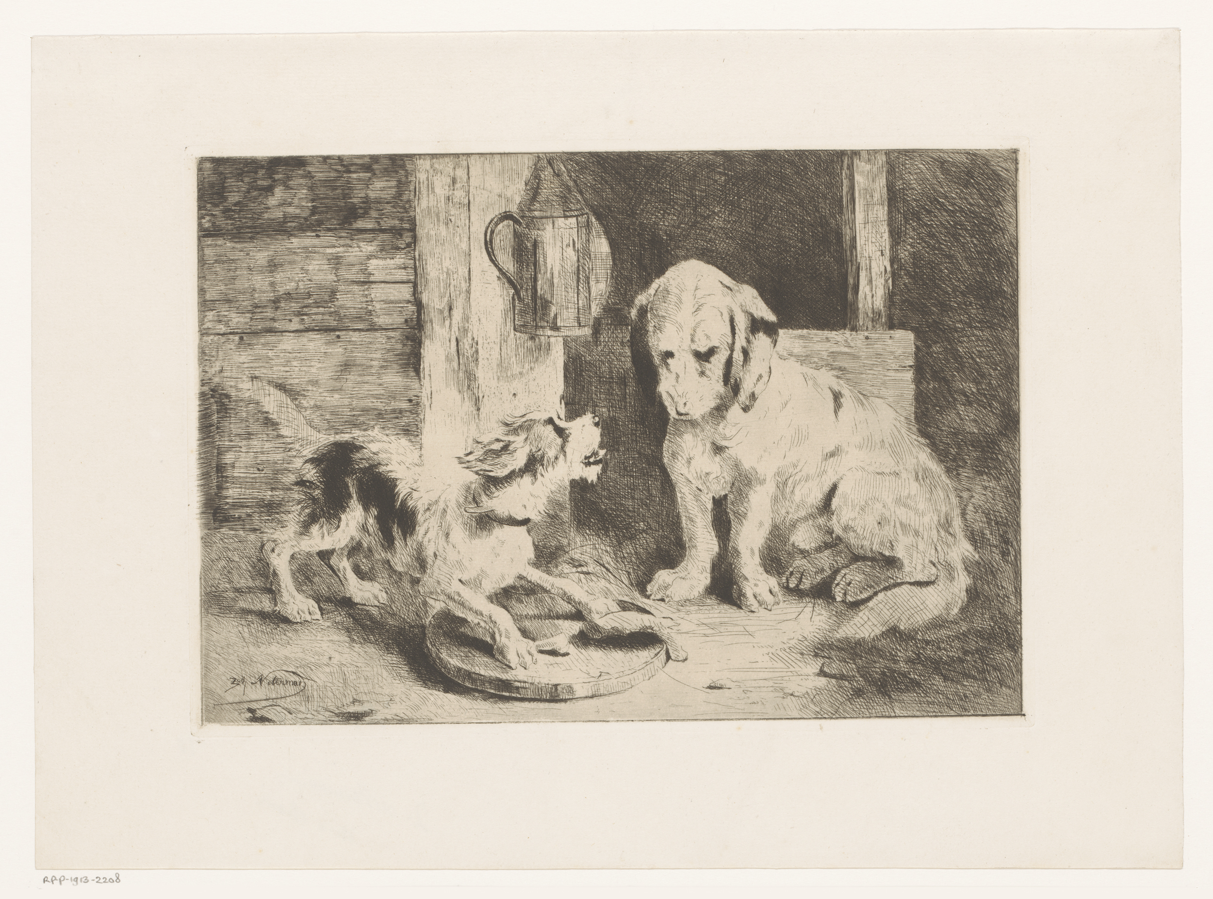 Twee honden bij een lantaarn en bord met eten