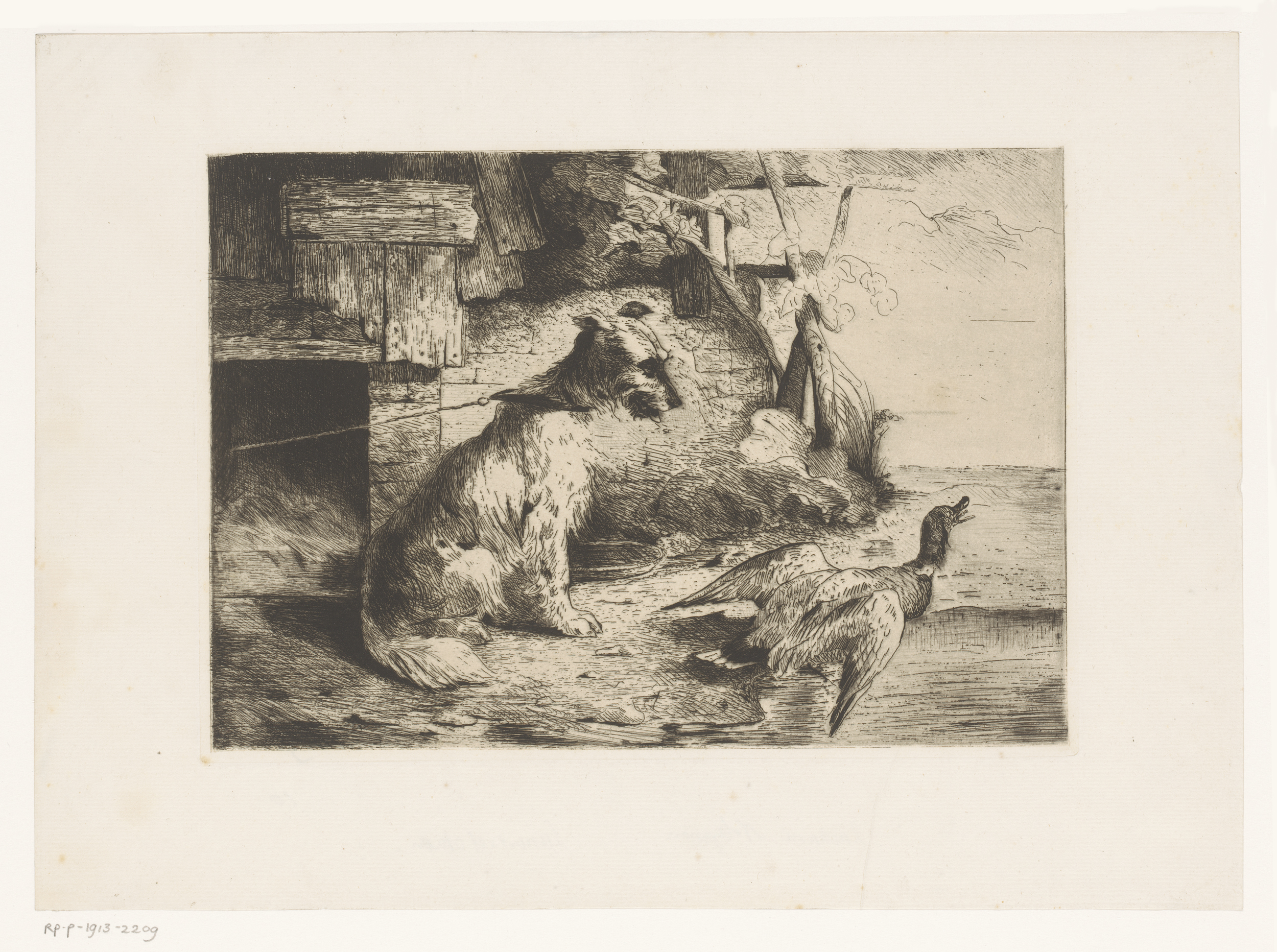 Hond aan een ketting en een eend