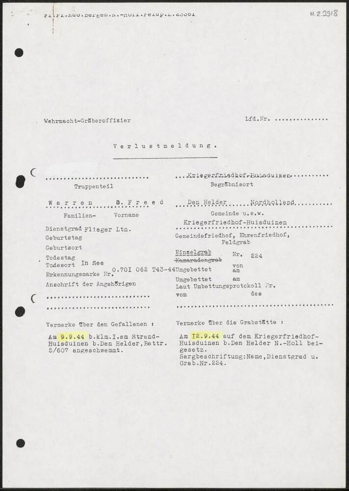 Namentliche Verlustmeldung Fl.Pl.Kdo. Bergen N-H, 12...