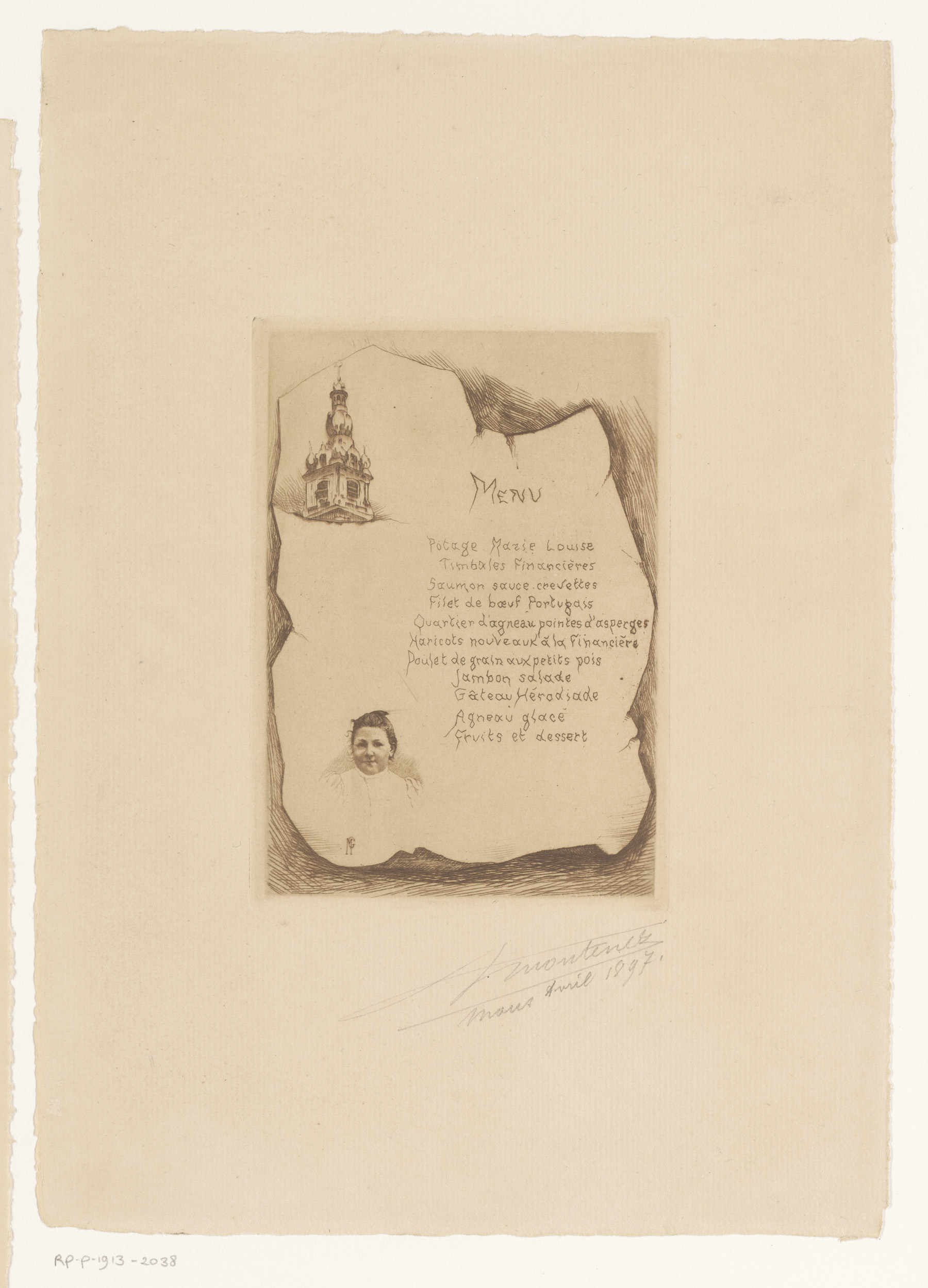 Menu gedecoreerd met voorstelling van een toren en e...