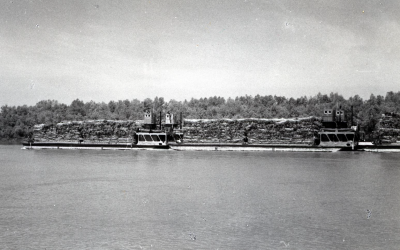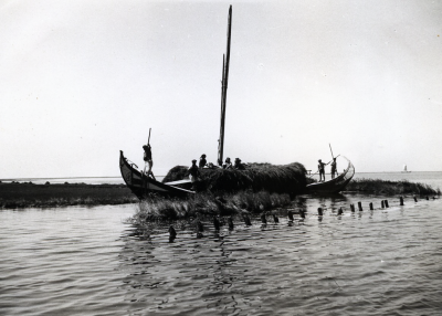 Sleepboot sleept schuiten of boten geladen met riet ...