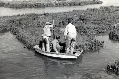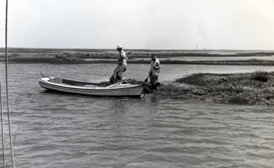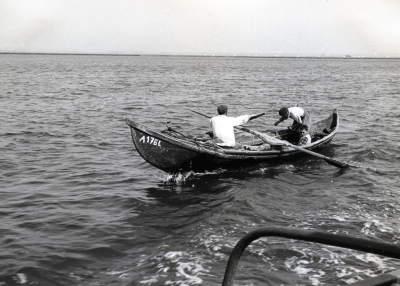 Mannen in een bootje bij Marateca, ongeveer 600 mete...