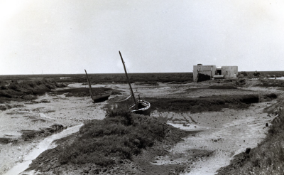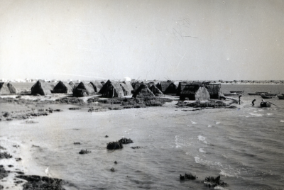 Vissershutten en schepen in Ludo, een gehucht bij Lo...