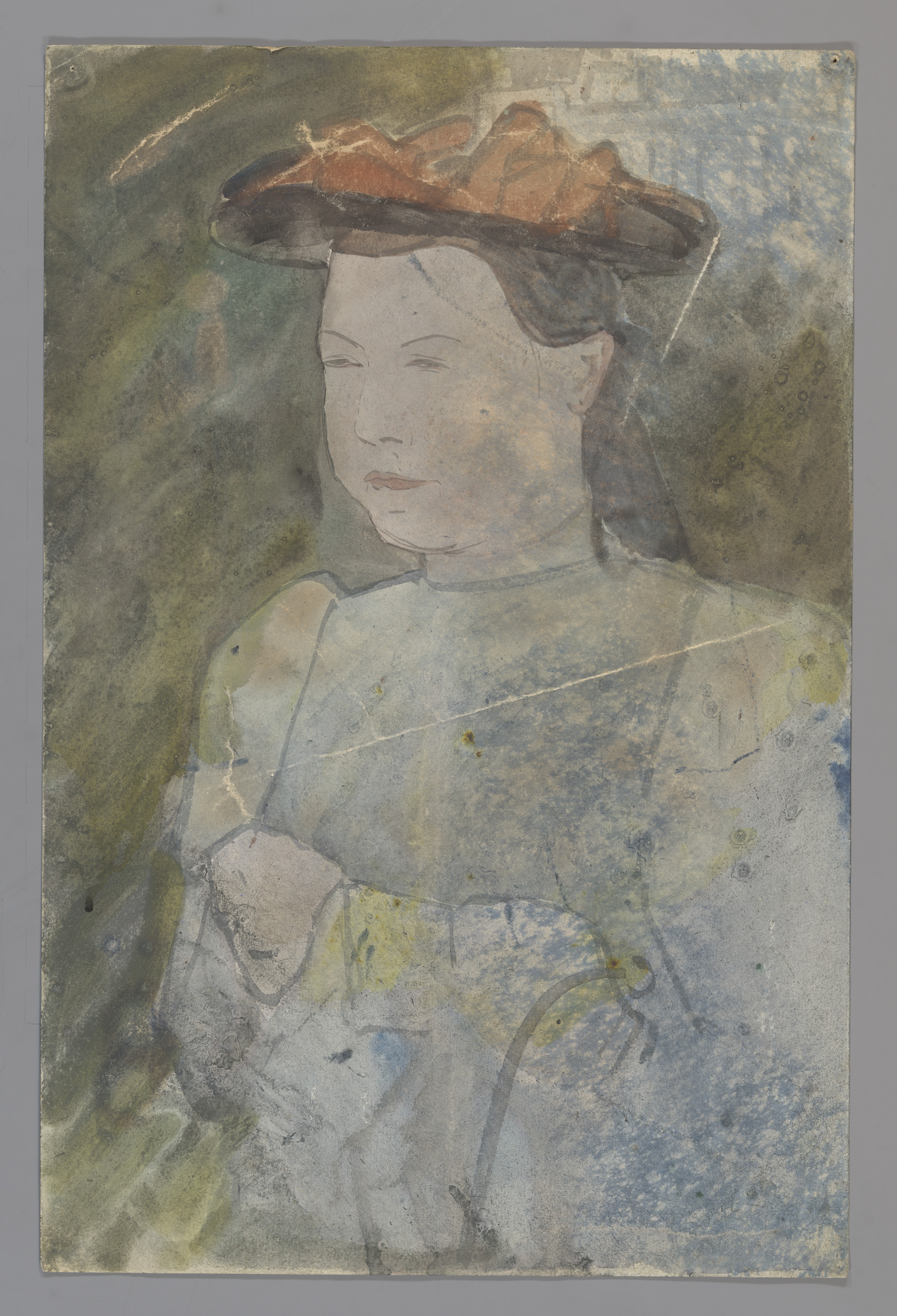 Zittende vrouw met platte hoed, steunend op haar lin...