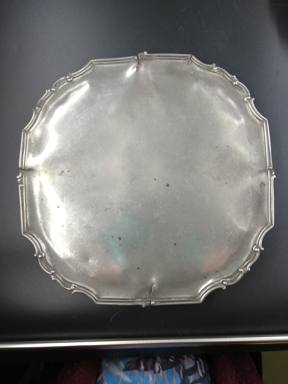 Tinnen, ondiepe grote schotel uit het Oude Mannenhuis.