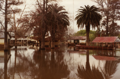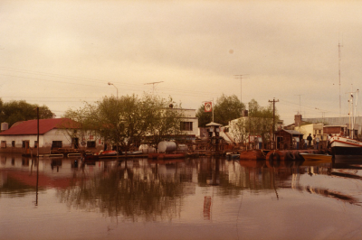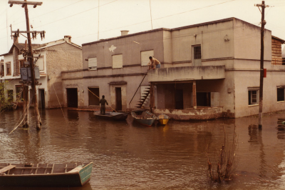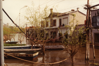 Overstroming in Argentinië. Huizen en een schip.