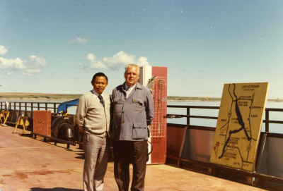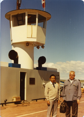 Adriaan Volker op een pont op Lake Diefenbaker, Sask...
