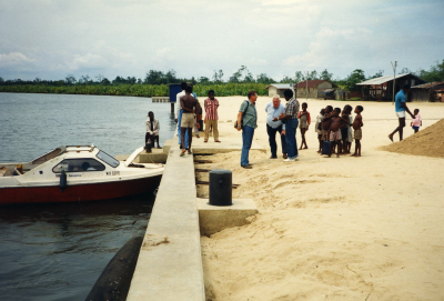 Adriaan Volker (blauw overhemd) op een kade in Madag...