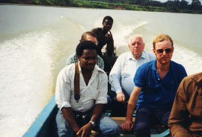 Adriaan Volker (blauw overhemd) op een snelle boot i...