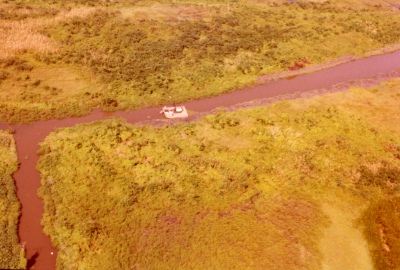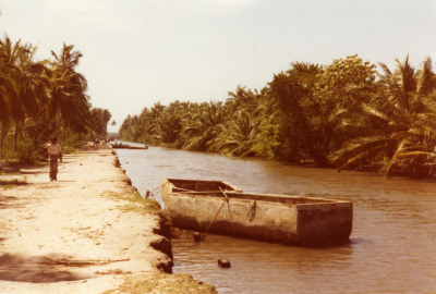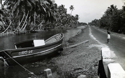 Kanaal in Sri Lanka, 1979. Op de oever een bootje.