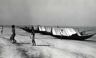Vissersboten op een oever in India, waarschijnlijk o...