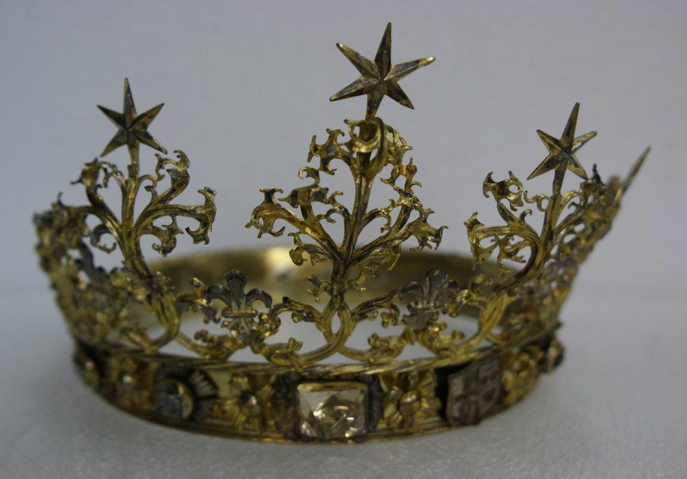 Zilveren (vergulde) kroon met opgelegde rozetten.