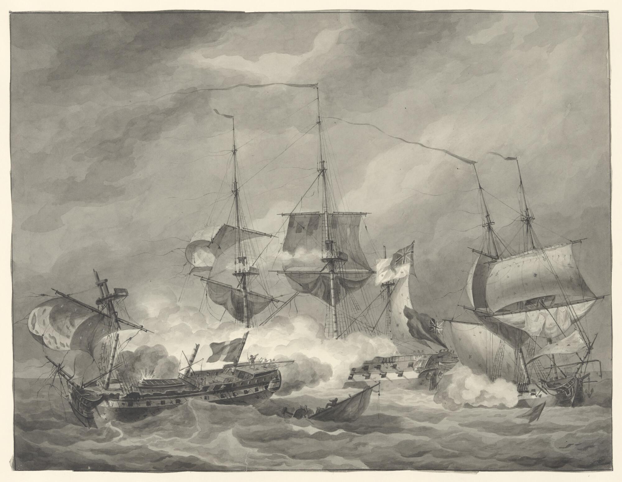 Gevecht tussen twee Engelse en een Frans oorlogsschip