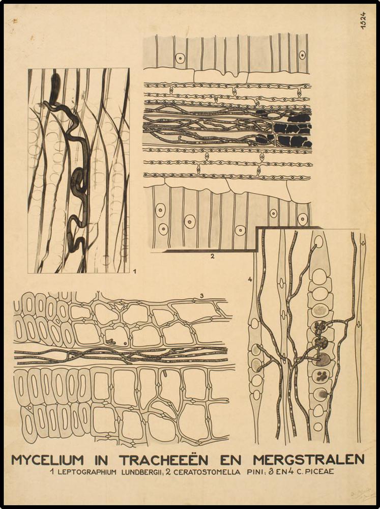 Mycelium in tracheeën en mergstralen