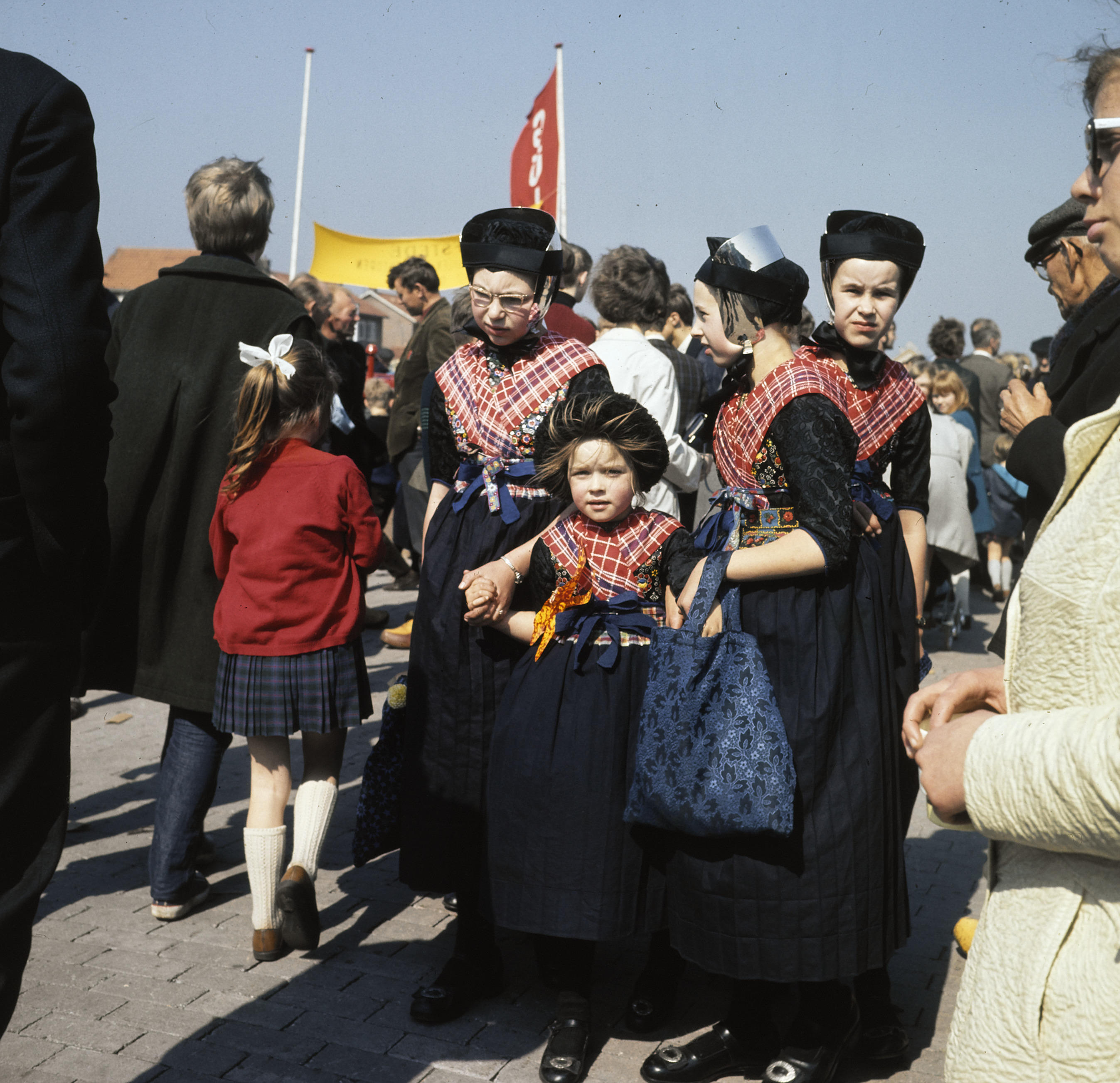 Meisjes op de jaarmarkt in Staphorst, 1968 (kleurendia)