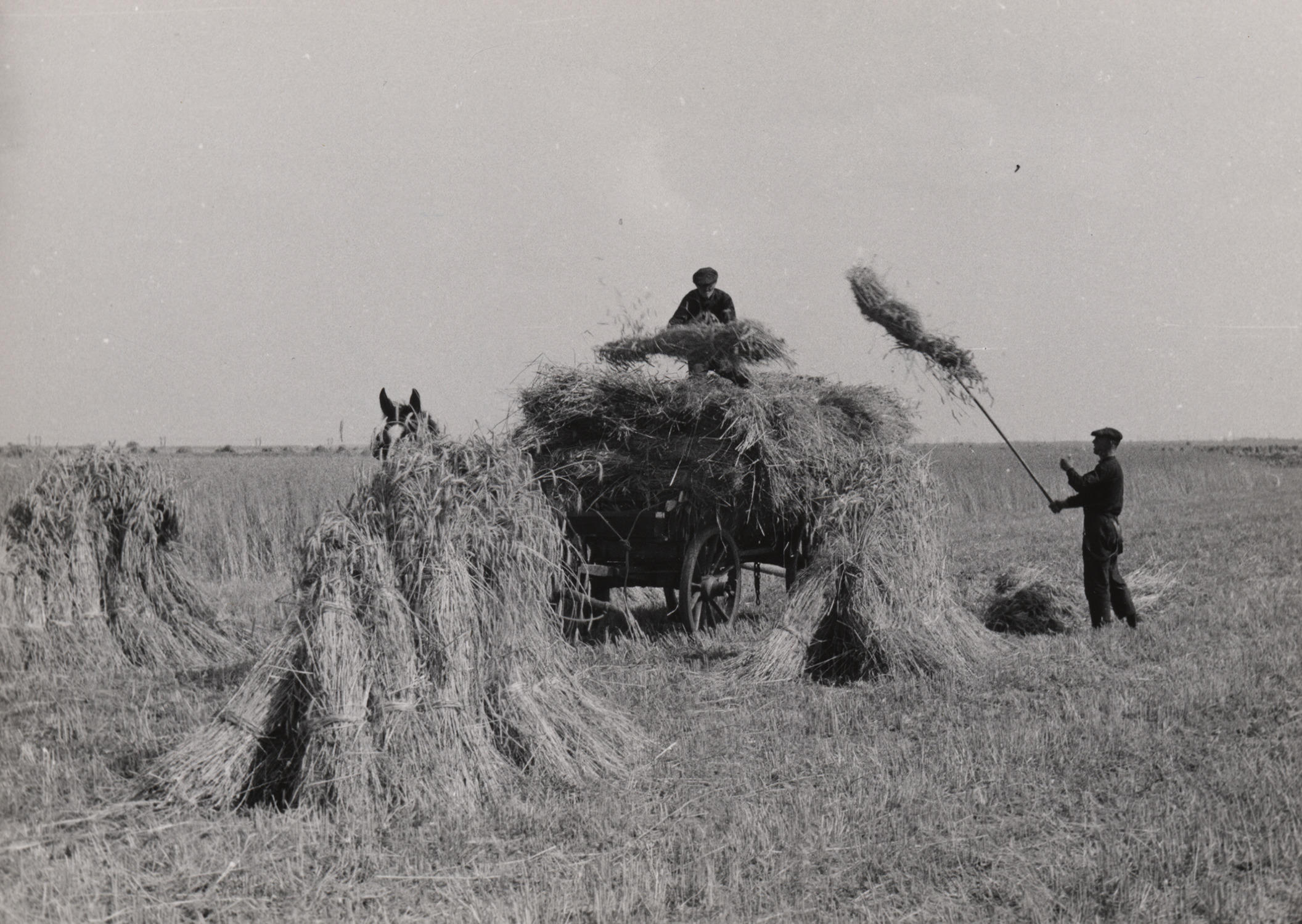 Binnenhalen van rogge, Staphorst, 1944 (zwart-wit foto)