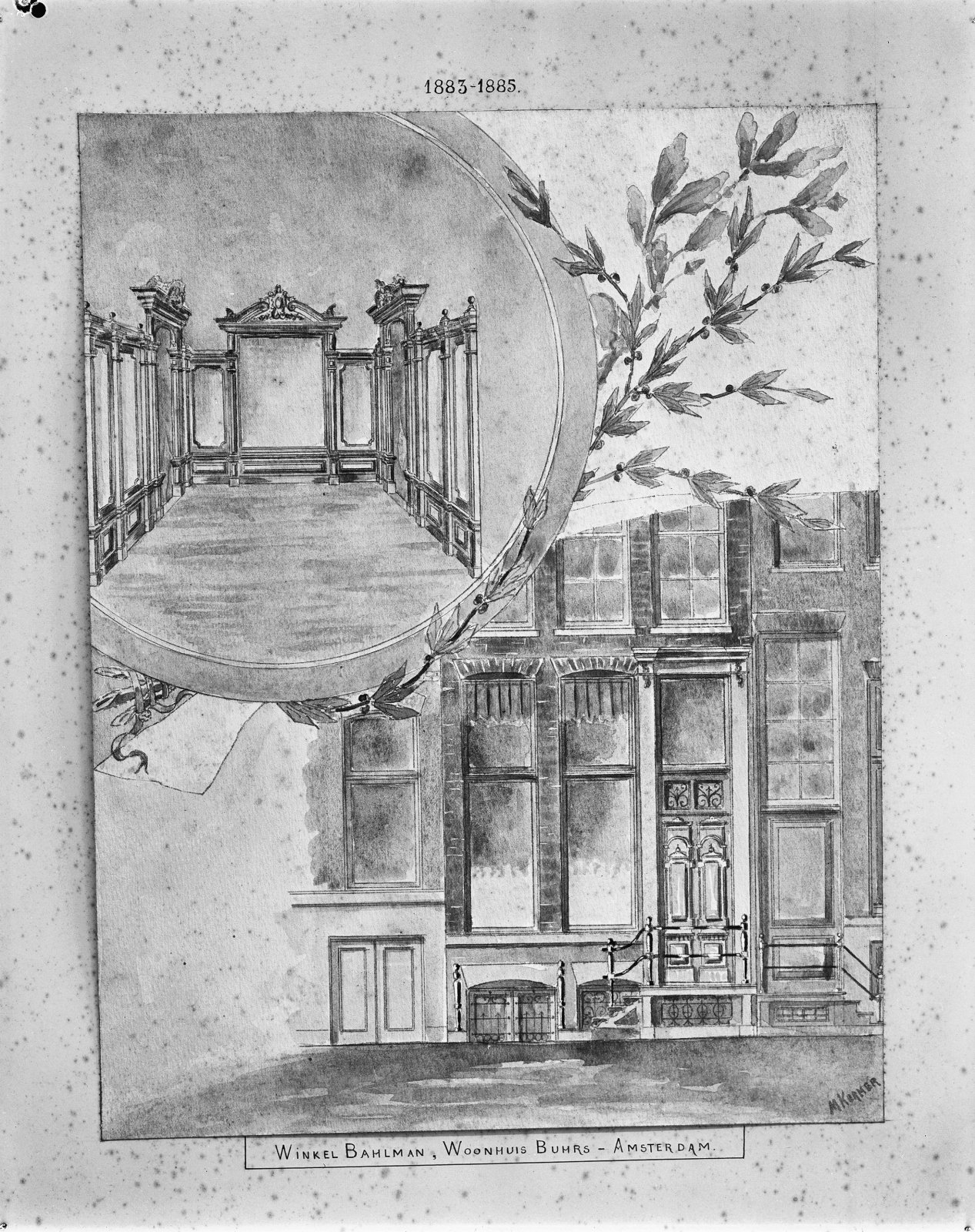 Tekening van voorgevel en interieur van Winkel Bahlman