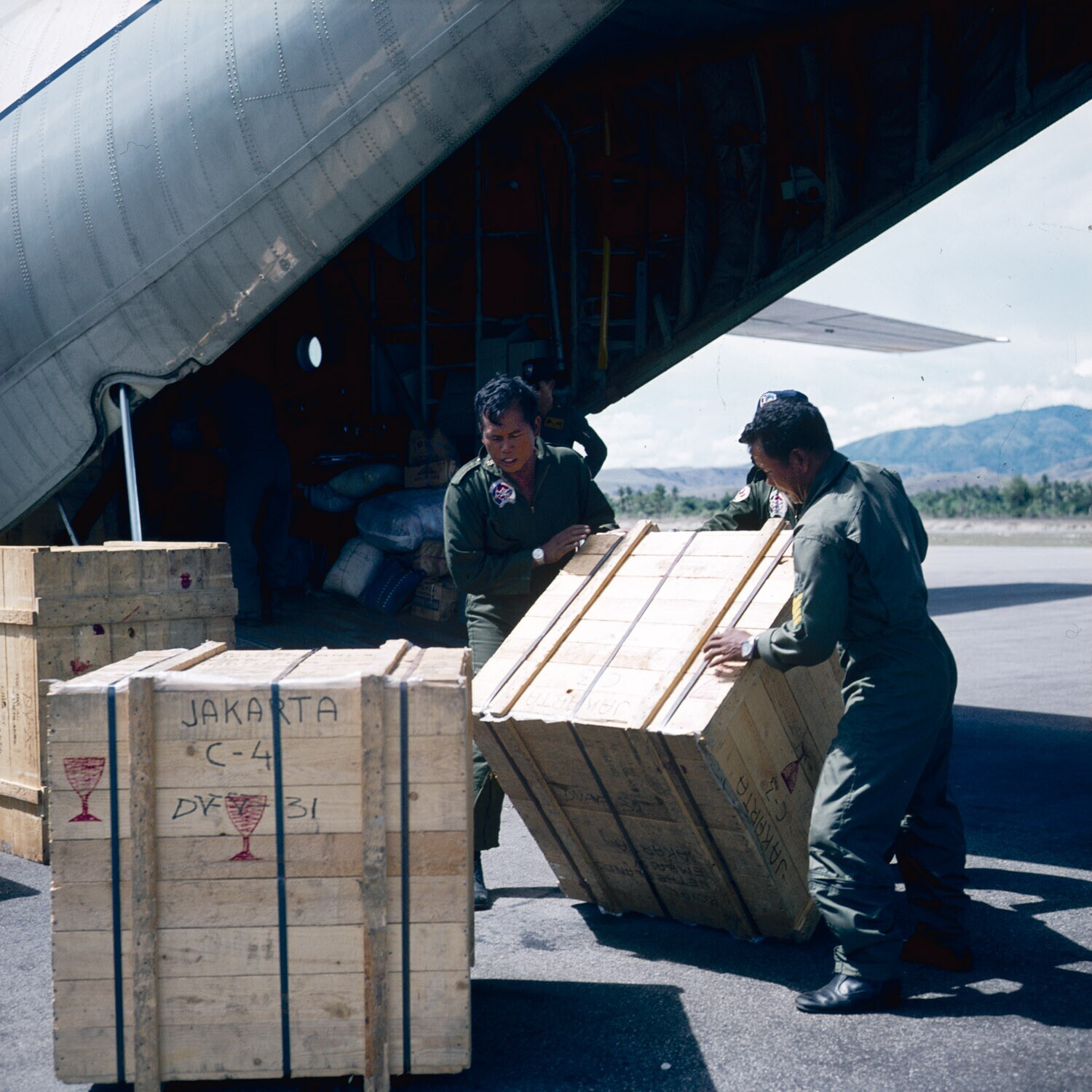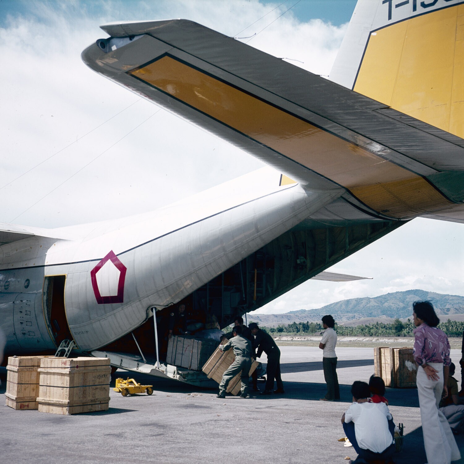 Militair vrachtvliegtuig op vliegveld bij Palu, Sula...