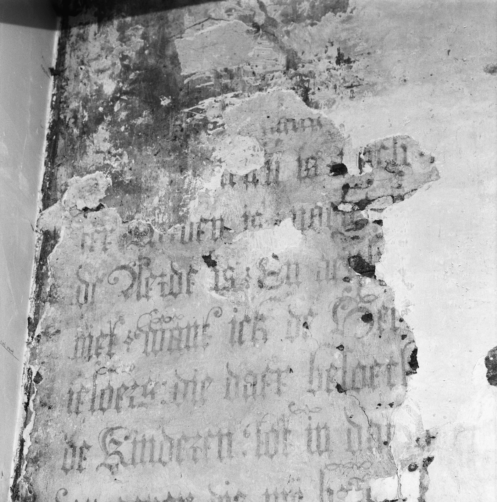 Interieur, detail tekst op voormalige buitenarm noor...