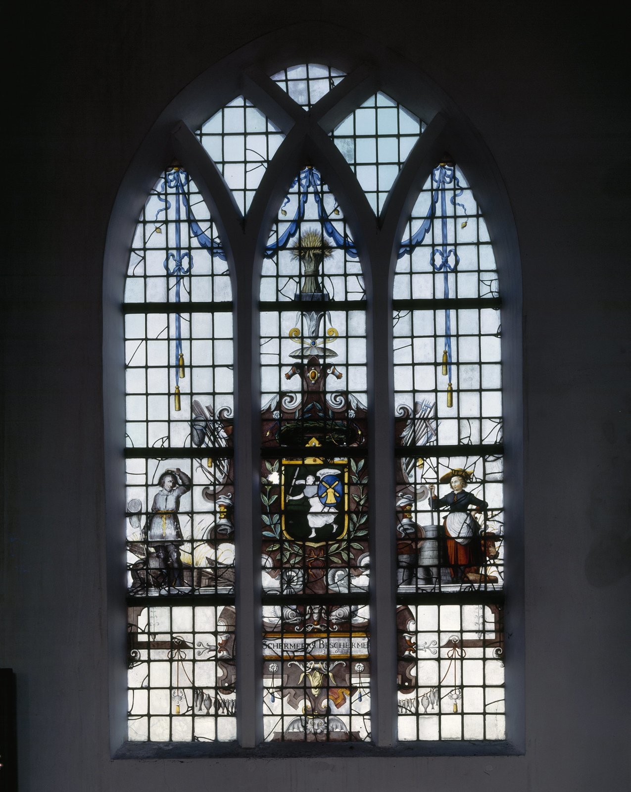 Interieur, gebrandschilderd glas, raam 15: "Wapen va...