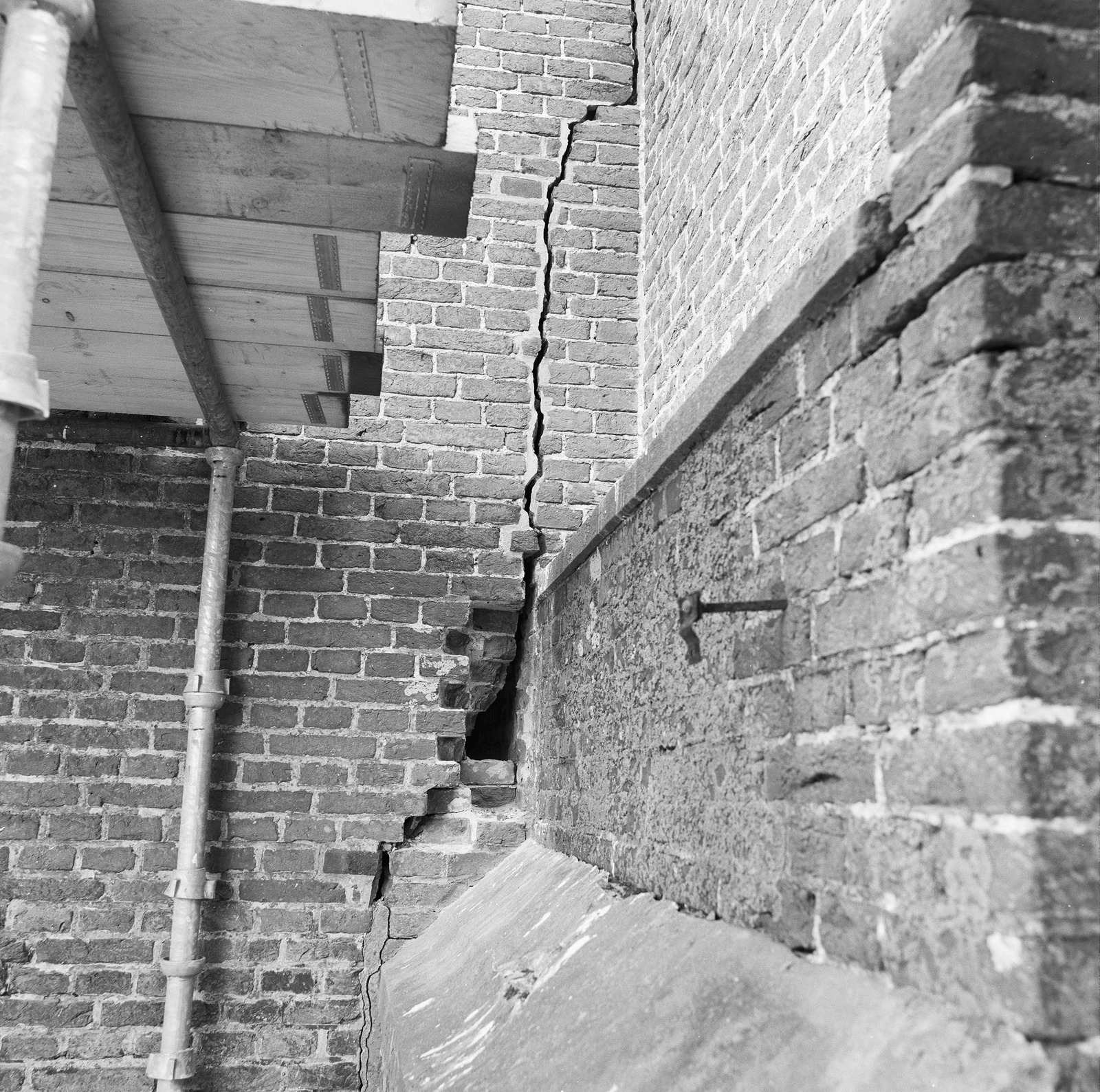 Aansluiting toren/kerk noordwest, in de steigers tij...