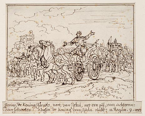 Joram op zijn wagen wordt door Jehu doorschoten