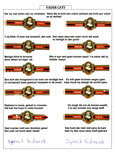 Blad met sigarenbandjes en spreuken van Vader Cats