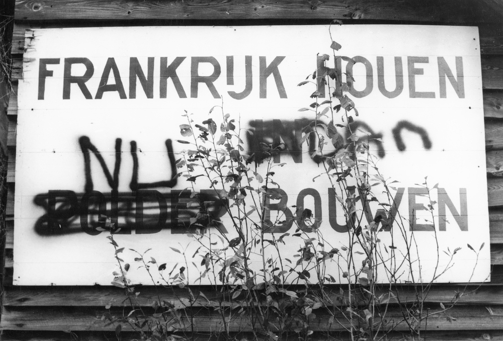 Protestbord tegen stadsuitbreiding in buurtschap Fra...
