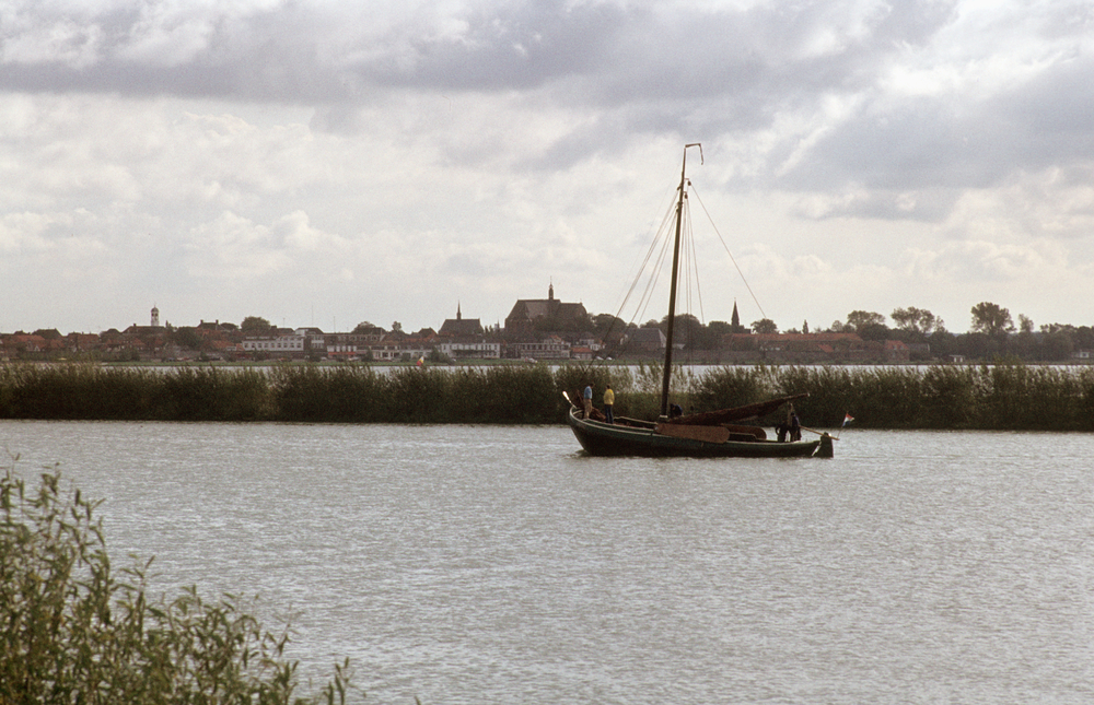 Een botter vaart langs de strekdam richting haven